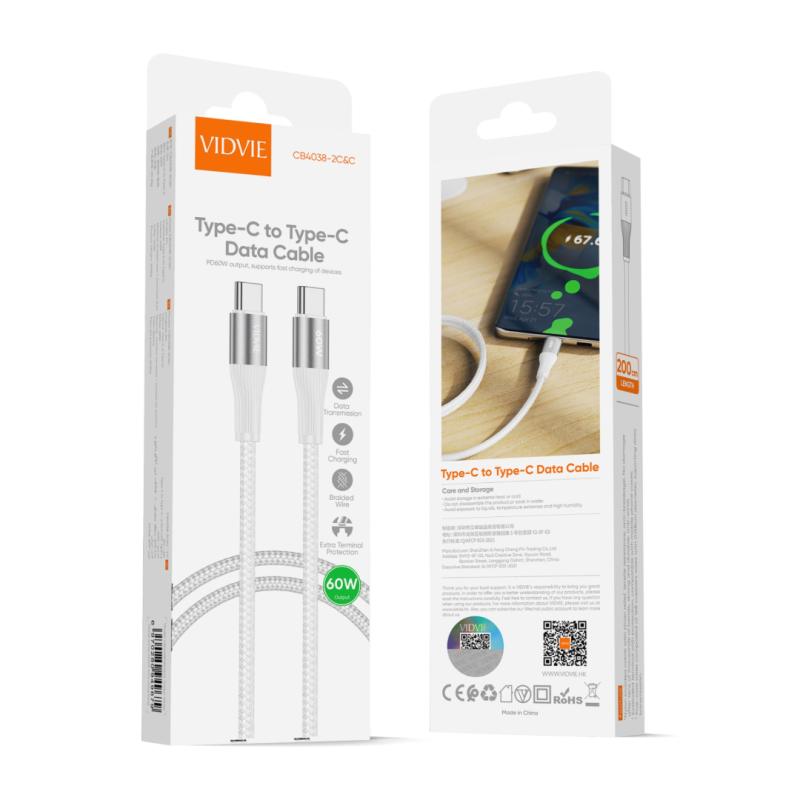 USB кабел VIDVIE CB4038 Type C to Type C 60W 2m